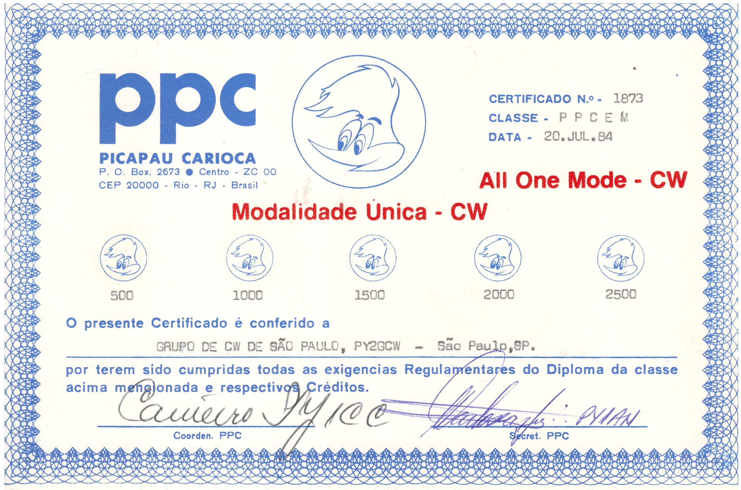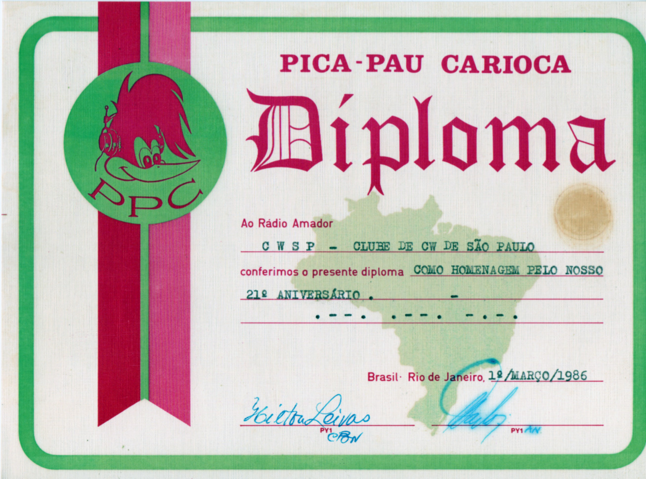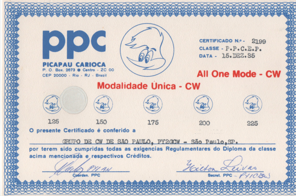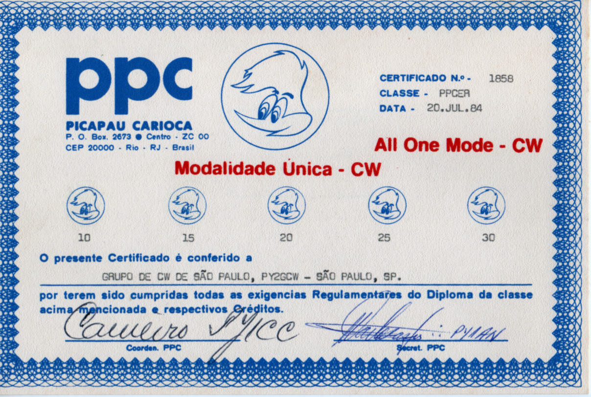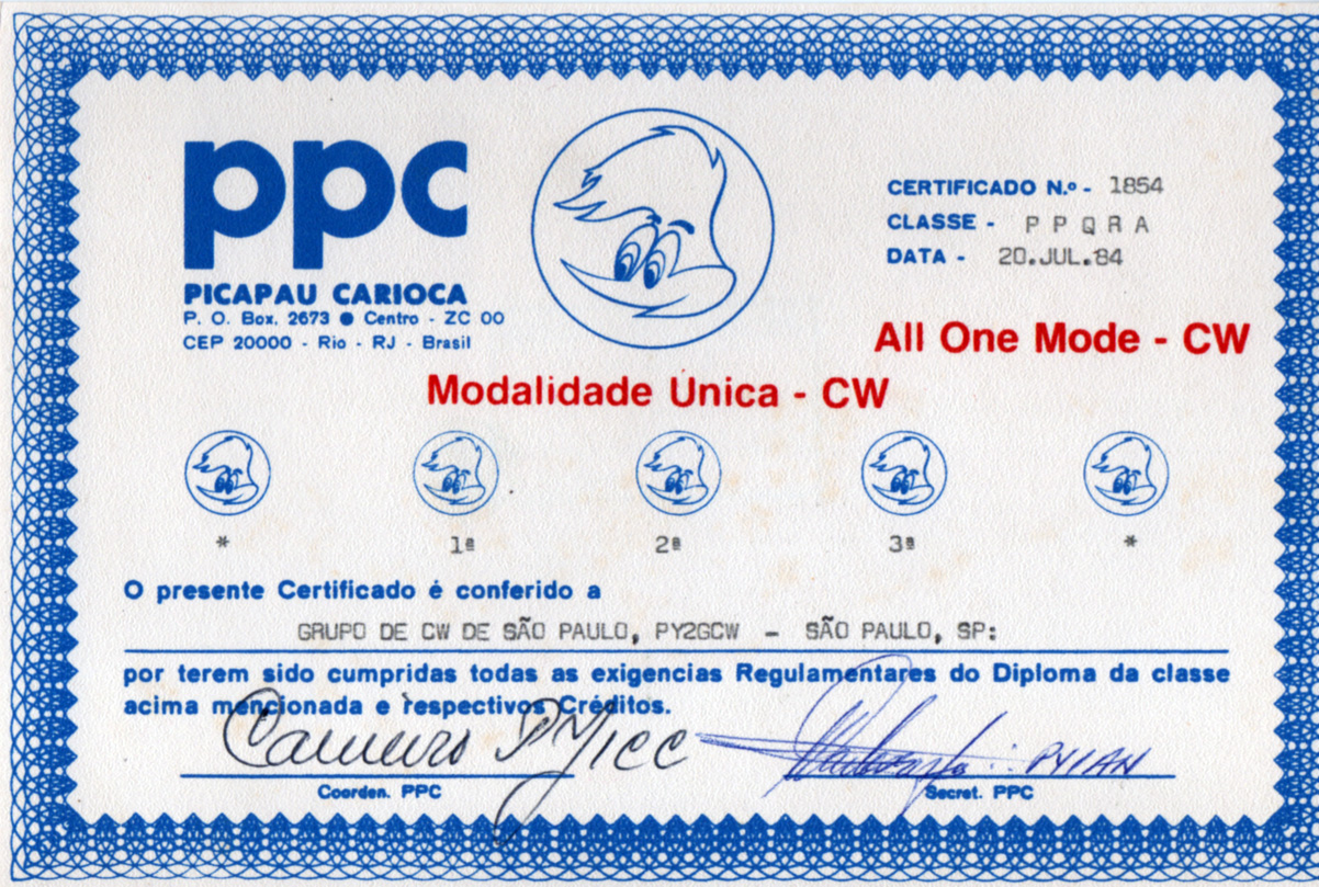 Nesta primeira galeria, todos os diplomas do PPC – Pica Pau Carioca, (primeiro grupo de CW do Brasil) conquistados pela antiga estação oficial do CWSP. As respectivas descrições estão nas fotos.