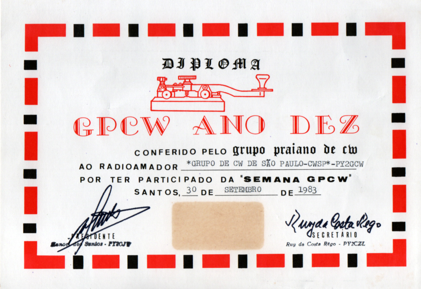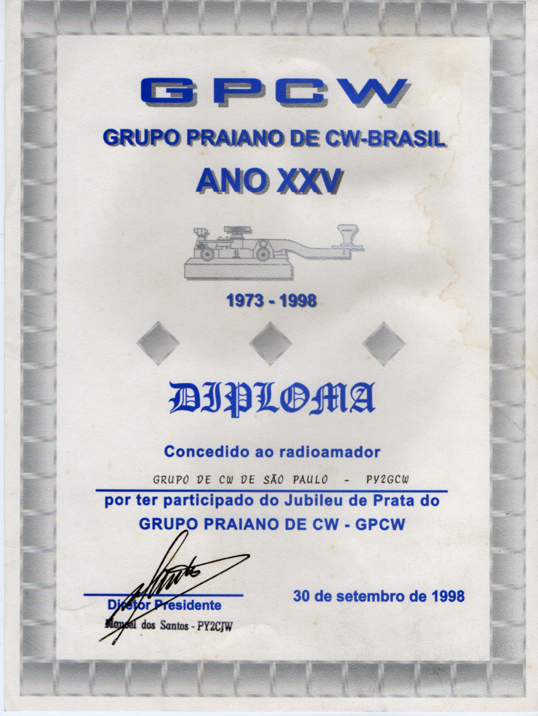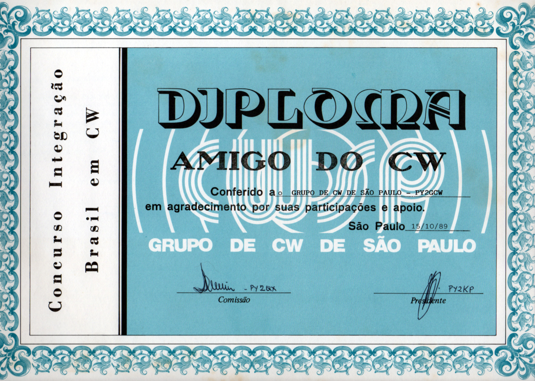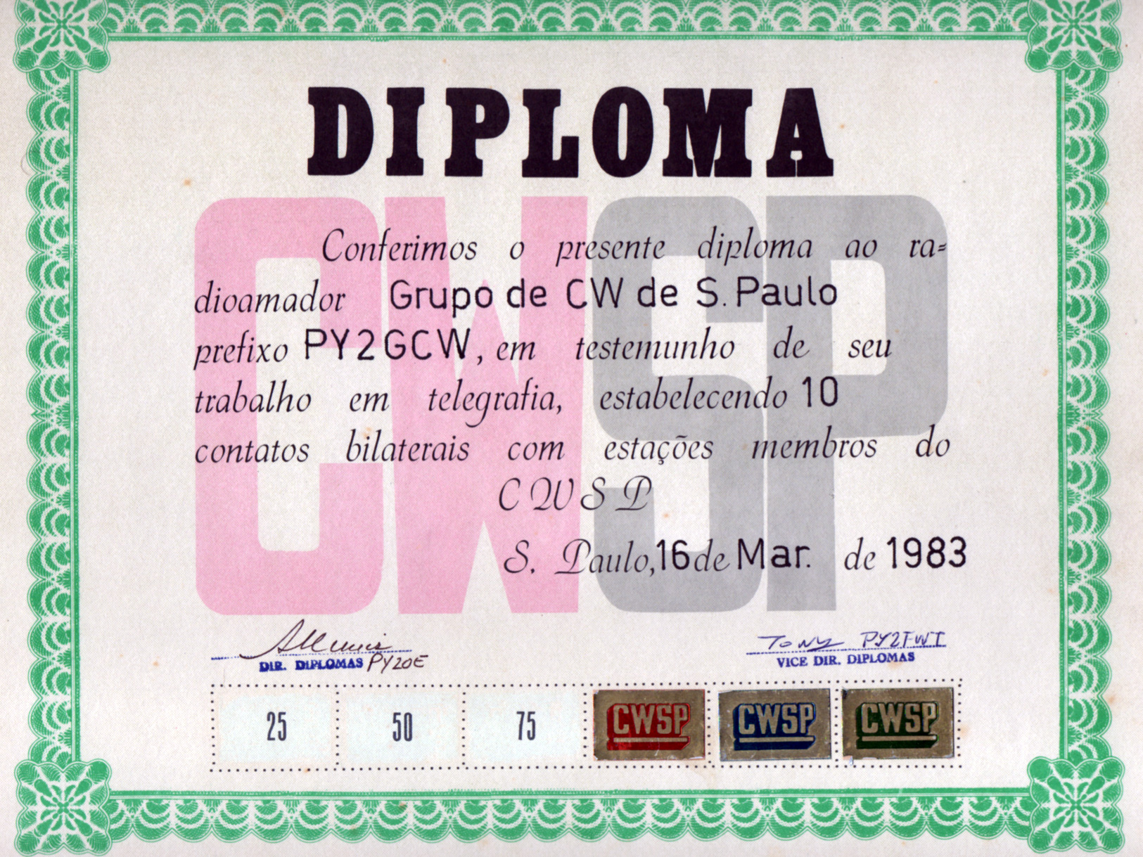 Aqui, os diplomas do GPCW – Grupo Praiano de CW, de Santos – SP.