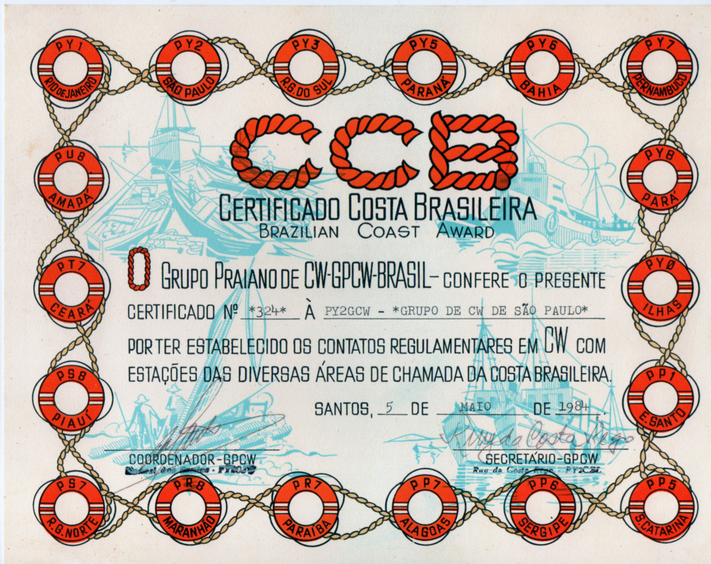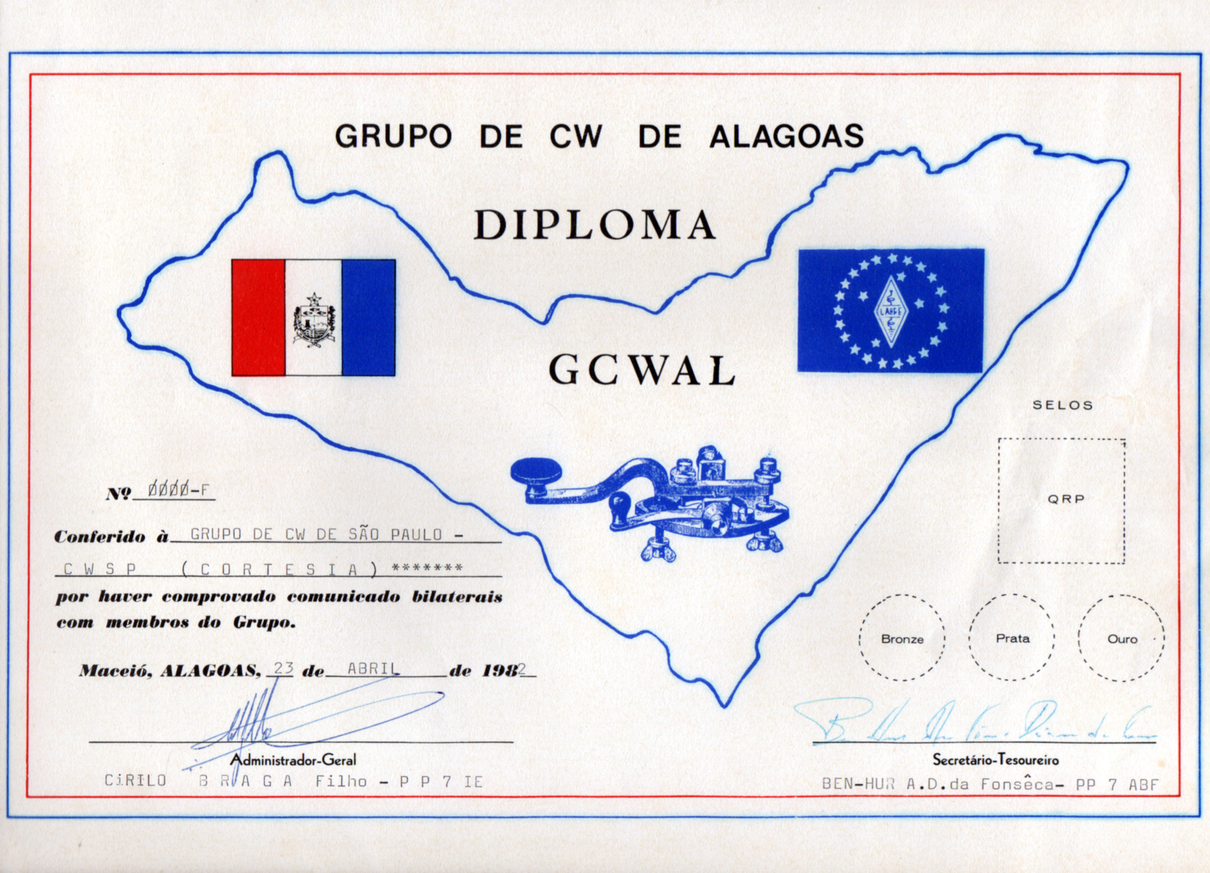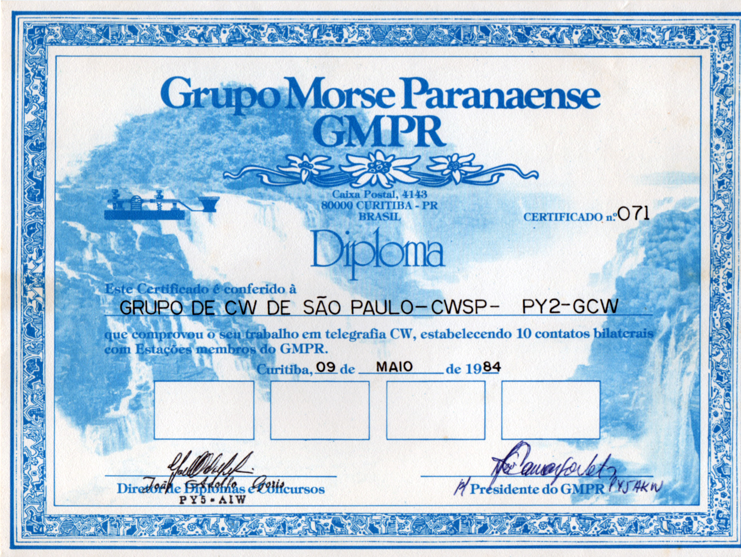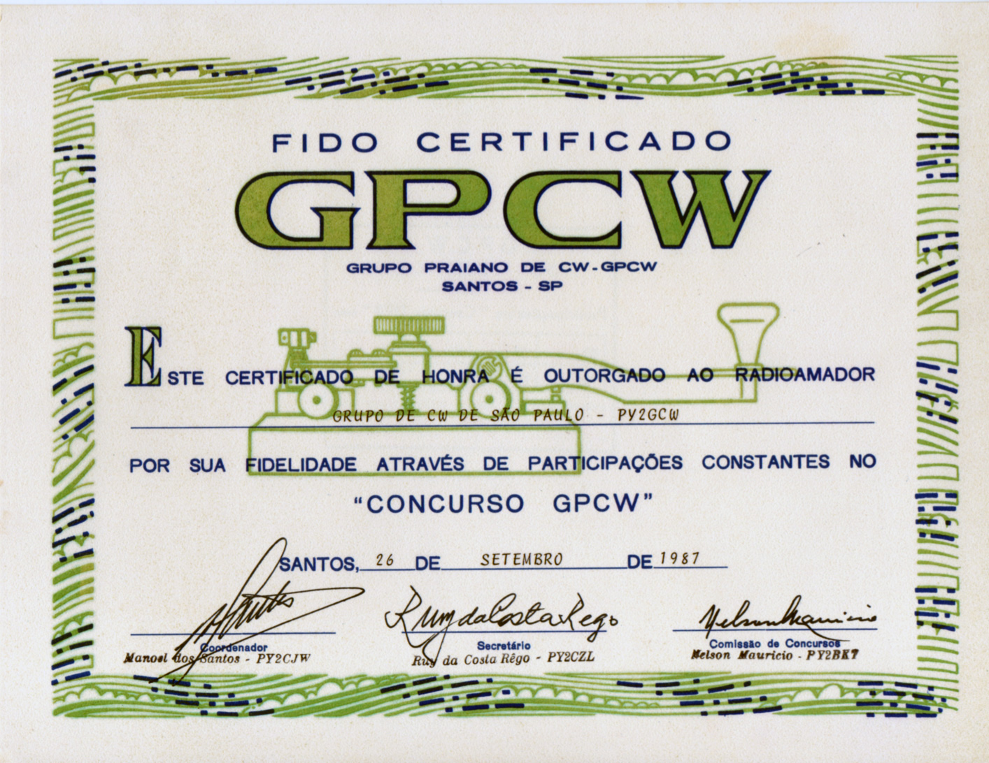 Aqui, os diplomas do GPCW – Grupo Praiano de CW, de Santos – SP.