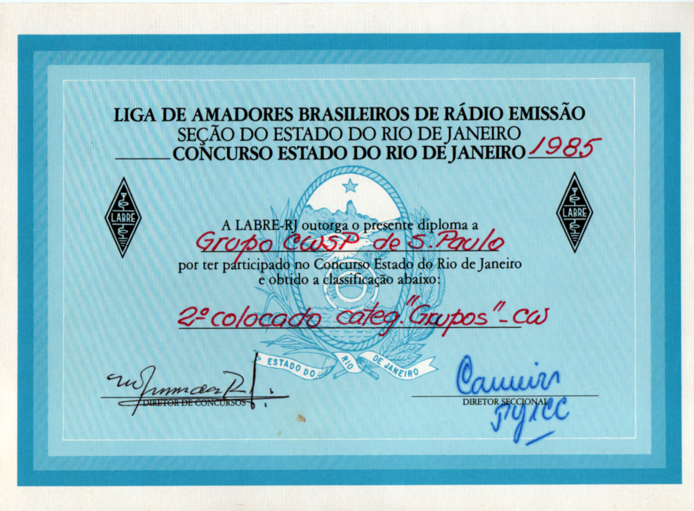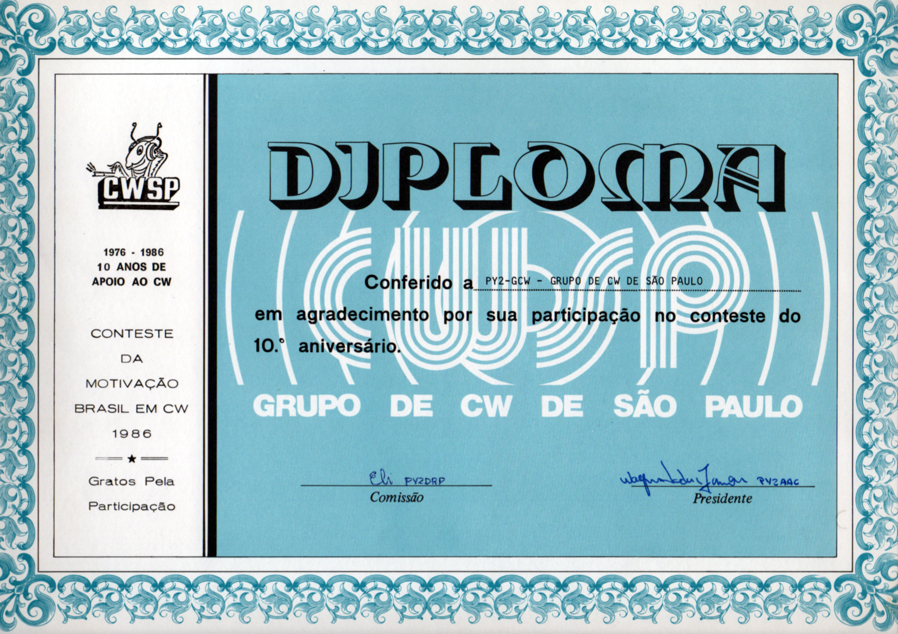 | Como este espaço é destinado aos operadores e conquistas da PY2GCW, são bem-vindas todas as contribuições que possam ser incorporadas ao acervo, como Diplomas, Fotos, Histórias (“causos” também) etc. Todas elas podem ser enviadas para admin@cwsp.com.br. |